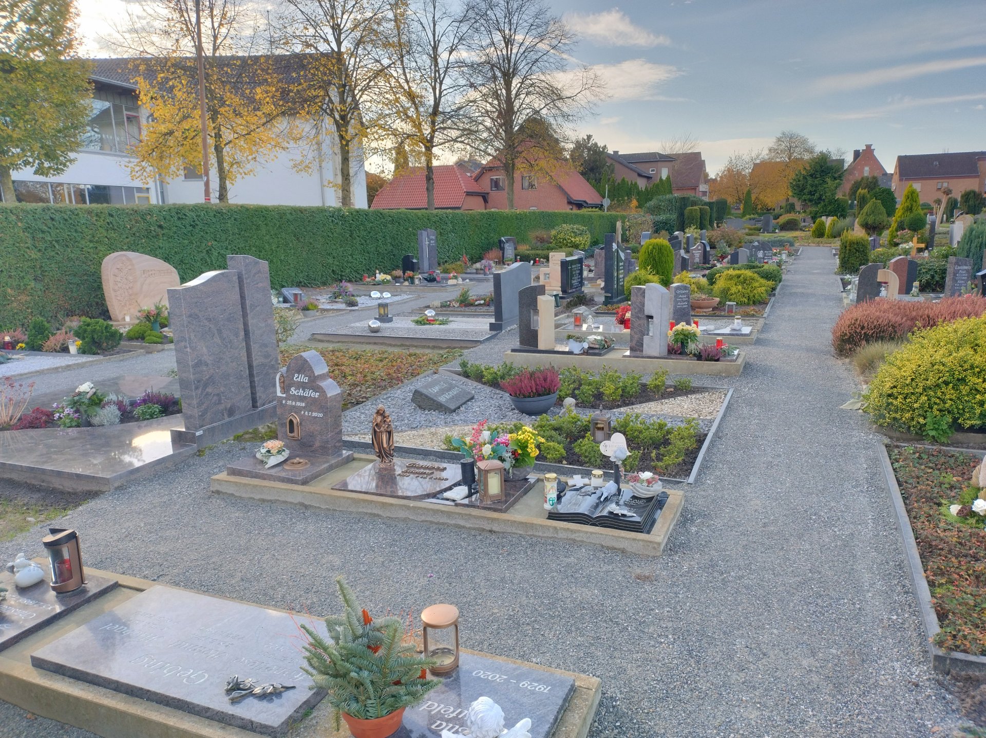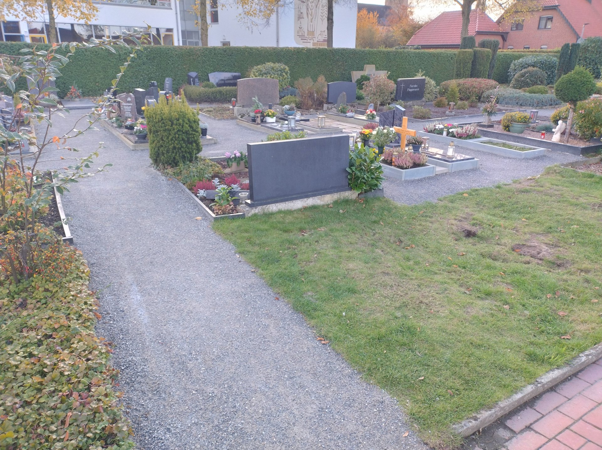 Die Friedhofsgärtnerei der Firma Seveneick hat im September in der südöstlichen Ecke vom Friedhof in Hörstel mit Koers DurEko-mix die Flächen zwischen den Gräber gepflastert. Das Ergebniss sieht sehr charmant aus. Das graue der Deckschicht ist ein Match zu den Randeinfassungen der Wege und der Gräber. Die Farben der Blumenarrangements, Kerzen und anderer Dekorationen, die Besucher aus Liebe zu ihren verstorbenen Angehörigen mitgebracht haben, sind ein Blickfang und verleihen dem Ganzen eine warme, emotionale Atmosphäre.