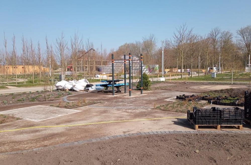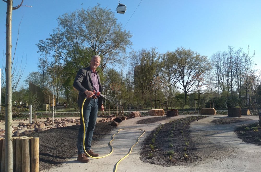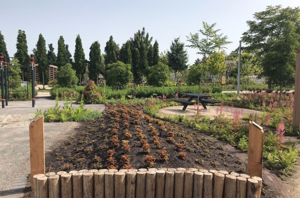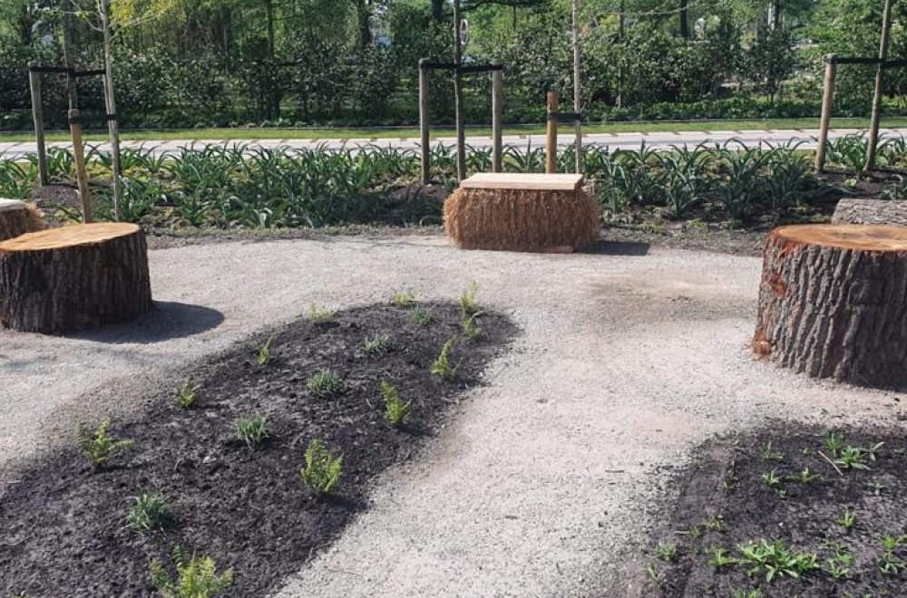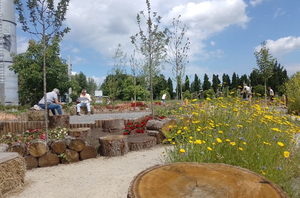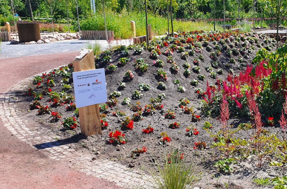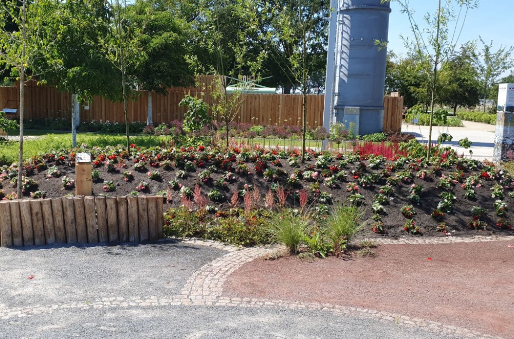Un mois après l'ouverture en avril, la parcelle a pris un vert frais. Après des arrosages fréquents, les arbres et les plantes plantés poussent et s'épanouissent maintenant. Et cela donne de belles photos ! La parcelle vaut vraiment la peine d'être visitée et de s'en inspirer, par exemple pour votre jardin respectueux de la nature ou pour une application durable dans l'espace public.