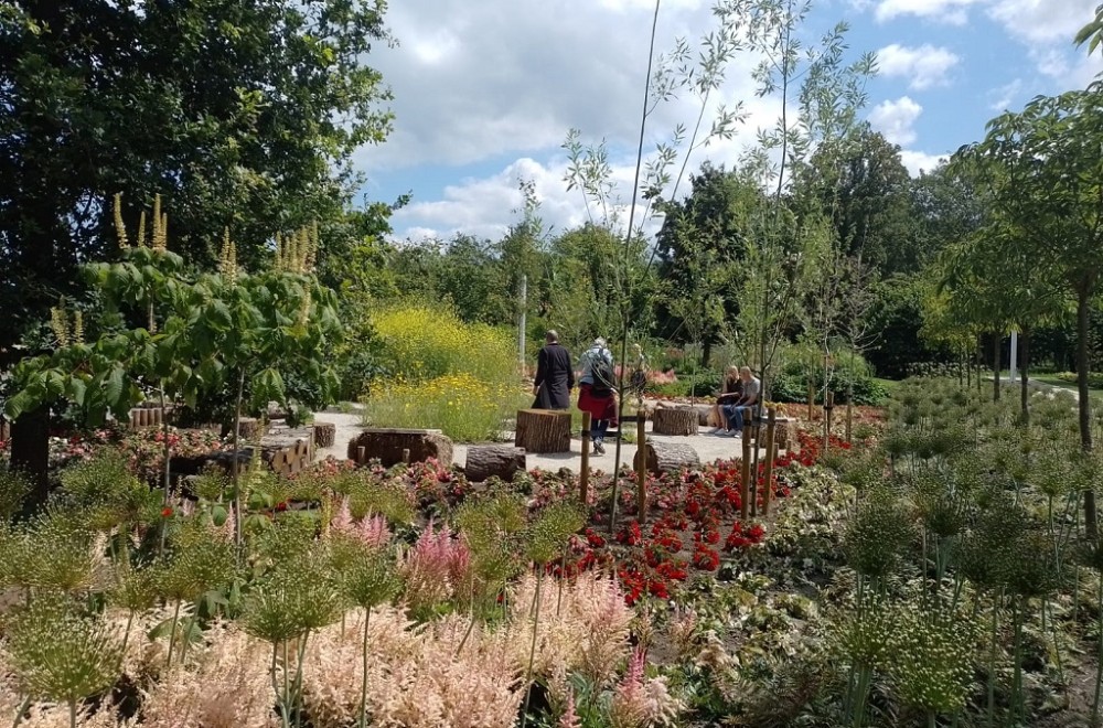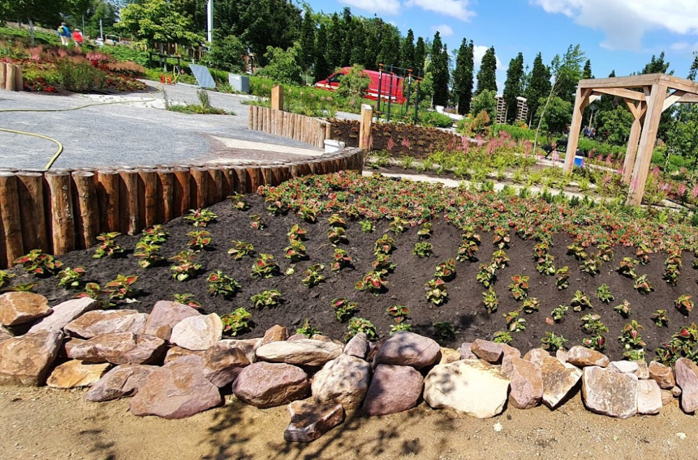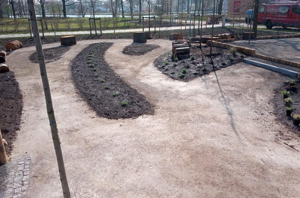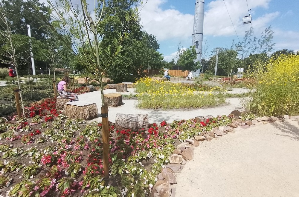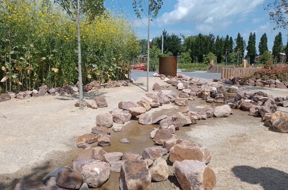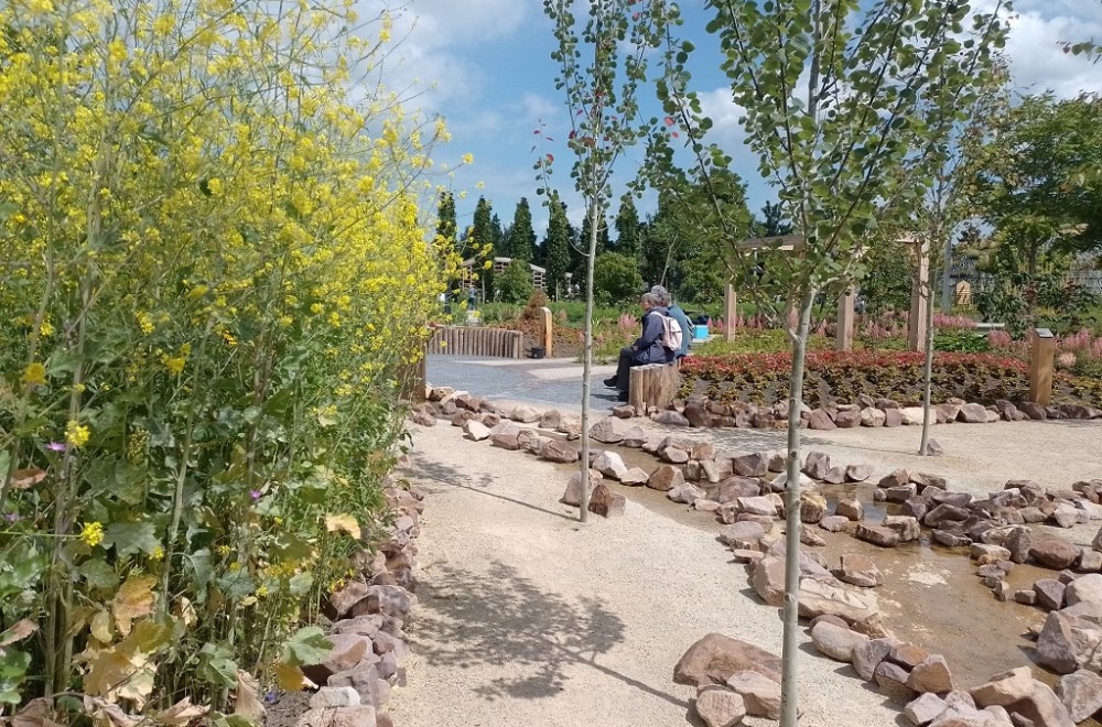 Un mois après l'ouverture en avril, la parcelle a pris un vert frais. Après des arrosages fréquents, les arbres et les plantes plantés poussent et s'épanouissent maintenant. Et cela donne de belles photos ! La parcelle vaut vraiment la peine d'être visitée et de s'en inspirer, par exemple pour votre jardin respectueux de la nature ou pour une application durable dans l'espace public.