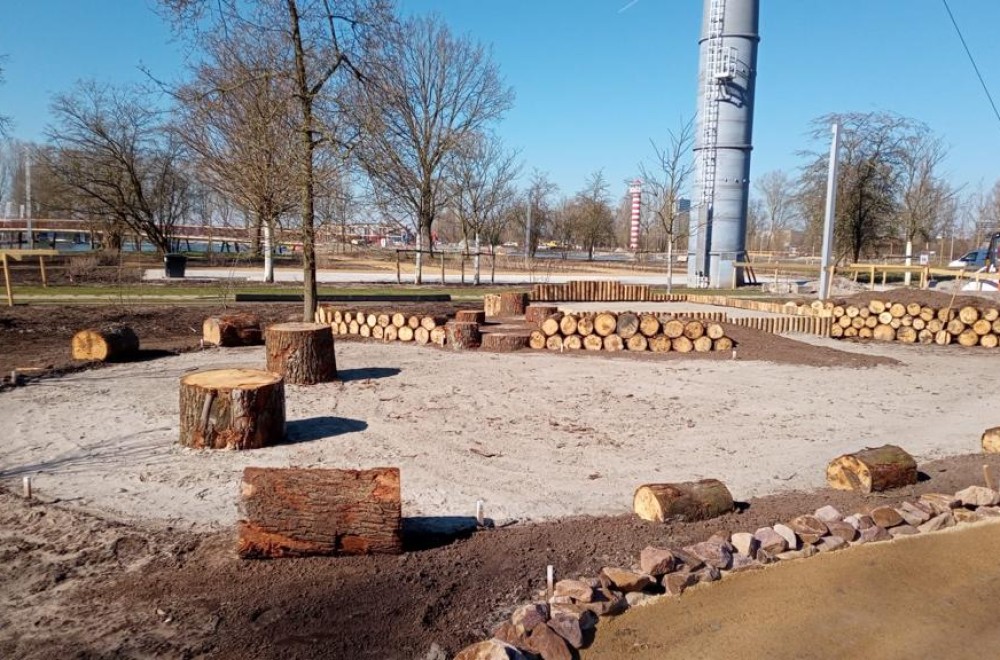 Urban leaf : DurEko-mix, pavés/carreaux en béton, acier, colonne d'information et équipement de terrain de jeux.