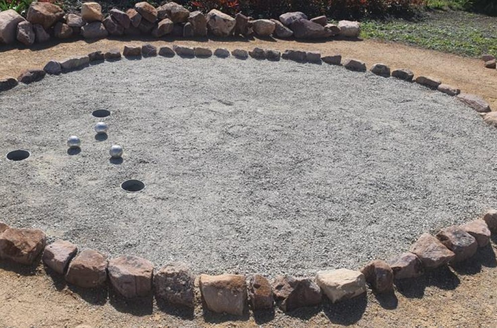 Parc aux feuilles : KoMex Jaune et Naturel, platines et pavés Grés, banc, pompe à main pour tampon d'eau