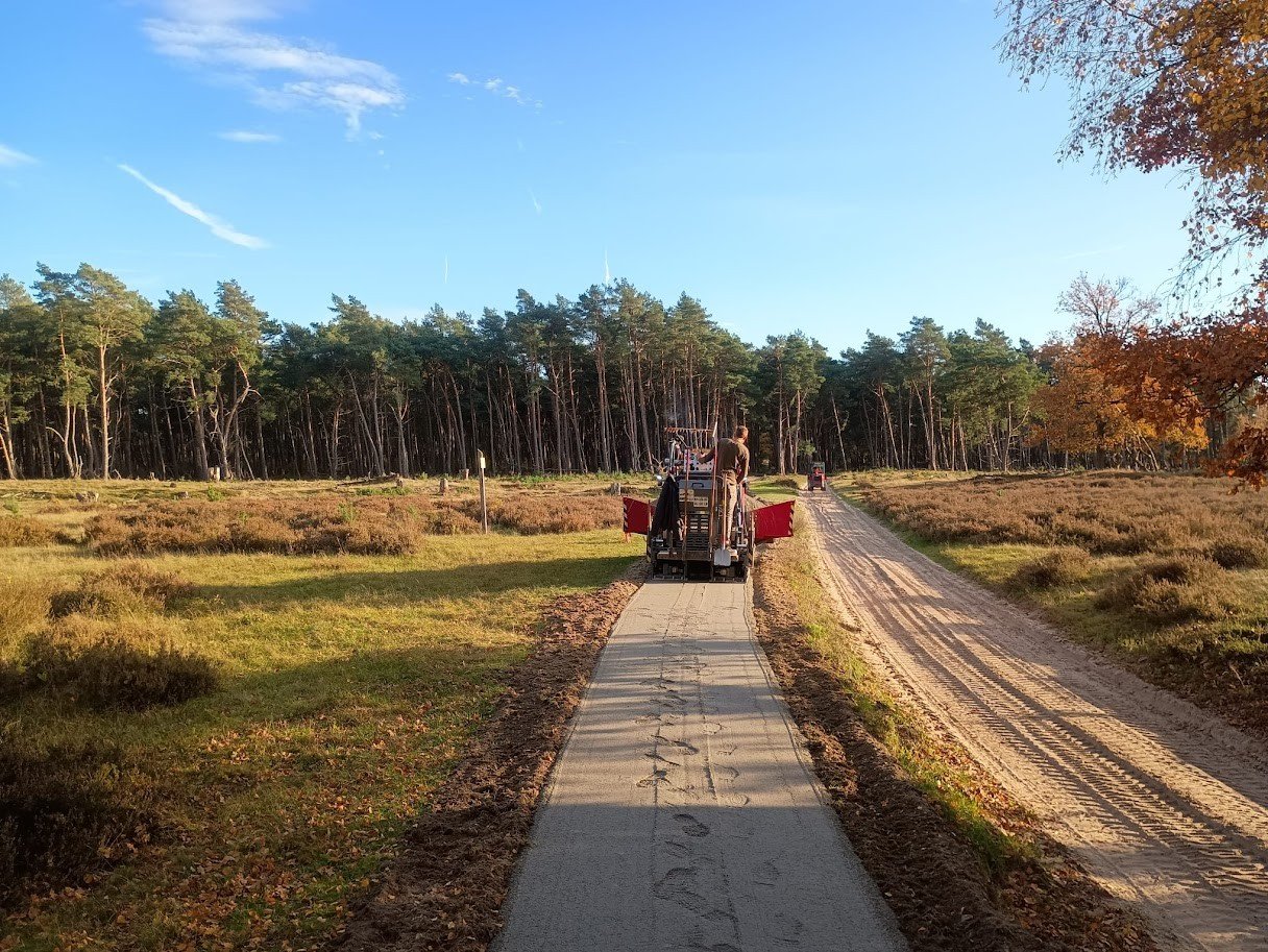Voor de aanleg van de fietspaden is bewust gekozen voor DurEko-mix, een waterdoorlatende halfverharding die uitstekend past binnen een kwetsbare en ecologisch waardevolle omgeving. Het materiaal biedt een hoge mate van stabiliteit en comfort voor fietsers, terwijl het tegelijkertijd een natuurlijk ogend oppervlak heeft dat harmonieus opgaat in het landschap van de Veluwe.